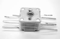Der Drehko besitzt eine Mittelwellenseite mit zweimal 280 pF und eine UKW-Seite mit zweimal 20 pF. Zusätzlich gibt es für jedes Segment einen kleinen Trimmkondensator mit jeweils ca. 20 pF, der mit einem Schraubendreher verstellt werden kann. Auf der Mittelwellenseite sind beide Trimmer mit einer eigenen Anschlussfahne versehen. Mit dem Masseanschluss in der Mitte hat man also auf dieser Seite fünf Anschlüsse. Der Drehko wird über eine Doppel-Schraubklemme mit der Steckplatine verbunden. Verwenden Sie den Masseanschluss und die beiden rechten Anschlüsse (Drehko und Trimmer), die zusammen eingeschraubt werden sollen.