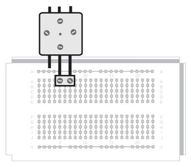 Die Steckplatine muss genau in die richtige Position montiert werden. Sie besitzt an der Unterseite eine doppelseitige Klebefolie. Schrauben Sie die Drehkoanschlüsse fest und stecken Sie die Schraubklemme zur Probe an die richtige Position der Steckplatine. Wenn alles passt, ziehen Sie die Schutzfolie der Klebeseite ab und drücken Sie die Steckplatine fest an ihre Position.