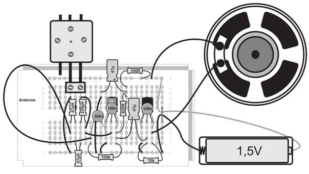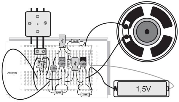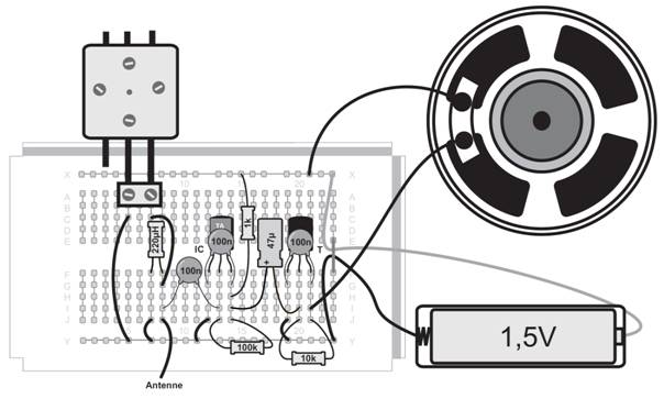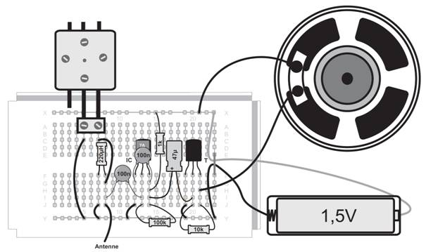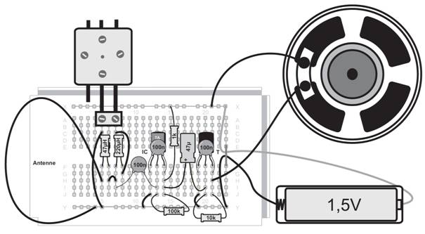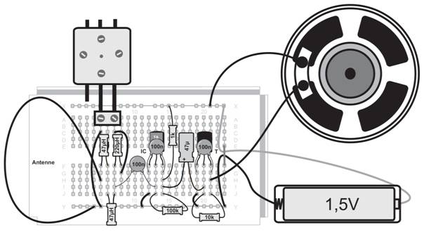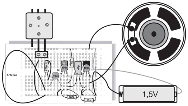 Ein weiterer Widerstand mit 100 kΩ (Braun, Schwarz, Gelb) dient ähnlich wie der Basiswiderstand des Transistors dazu, einen kleinen Eingangsstrom fließen zu lassen. Dieser Strom kann dann durch schwache Radiosignale vergrößert und verkleinert werden. Die Änderungen werden verstärkt und hörbar gemacht.
