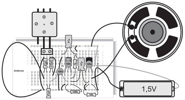 Obwohl das Gerät noch lange nicht fertig ist, können Sie mit etwas Glück jetzt bereits Radio hören. Wenn ein starker Sender in Ihrer Nähe steht, reicht sein Signal vielleicht schon aus, um empfangen zu werden. Ihr Körper wirkt dabei als Antenne. Genauso wirksam ist aber auch ein langer Draht.