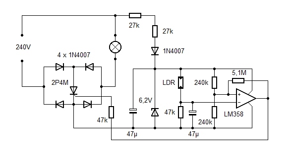 SMD-Thyristor 2P4M, fünf Dioden 1N4007 und einen OPV LM358. Der 2P4M