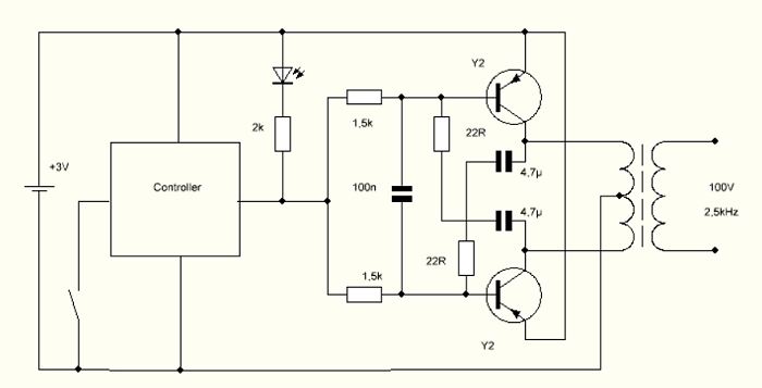 Schaltung zeigt einen selbstschwingenden Gegentaktwandler mit zwei