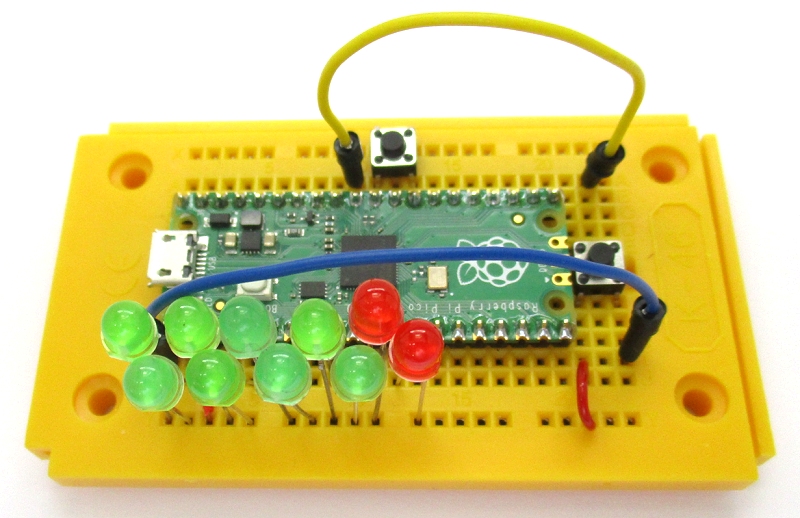 Die gelesenen Eingangszustände werden mit 16 multipliziert und an die Portausgänge ausgegeben. Dadurch werden alle Änderungen an den vier Eingängen auch an den vier Ausgängen sichtbar. Zum Test kann man einzelne LEDs an den Eingängen kurzschließen. Das entsprechende Bit wird dann als 0 gelesen, sodass die zugehörige Ausgangs-LED ebenfalls abgeschaltet wird.