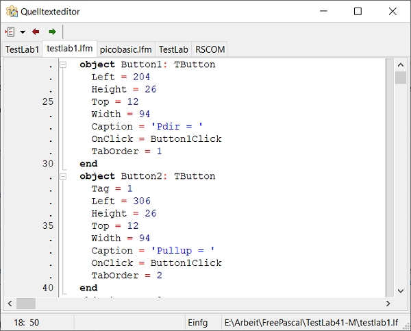 1) Zunächst wurde die Benennung der Buttons geändert, also lediglich umgetragen. Das geschah in der Datei "testlab1.lfm" in den Zeilen mit "Caption". Die Buttons in der IDE haben auf diese Weise neue Namen. Die Zuordnung zu den auszuführenden Funktionen sind so aber noch ungeändert. Das erfolgt erst im nächsten Schritt 2). Zusätzlich wurden aber noch die x- und y-Werte (Left, Height, Top, Width) der Button-Platzierungen in einem festen Raster vereinheitlicht.