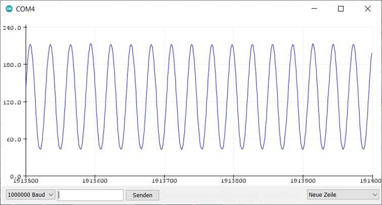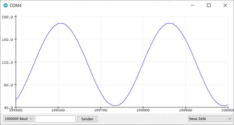 Eine volle Sinusschwingung wird hier in 256 Punkten ausgegeben, sodass auf den Schirm mit seinen 500 Messpunkten fast zwei volle Schwingungen passen. Die Frequenz des Signals beträgt 244 Hz, wie oben im Zusammenhang mit Sägezahnsignalen schon berechnet wurde: 16 MHz / 256 / 256 = 244 Hz.