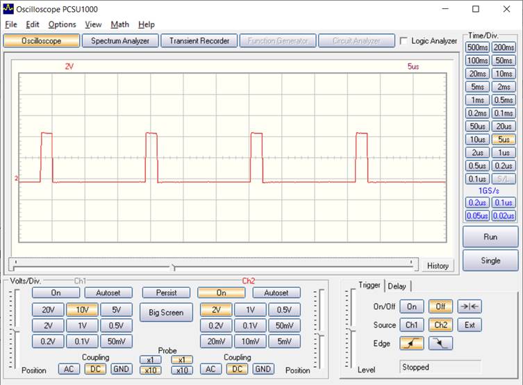 Ein Blick auf das Signal an PD2 zeigt die geringe Auslastung der Interrupt-Routine von nur rund 10% der verfügbaren 16 µs.