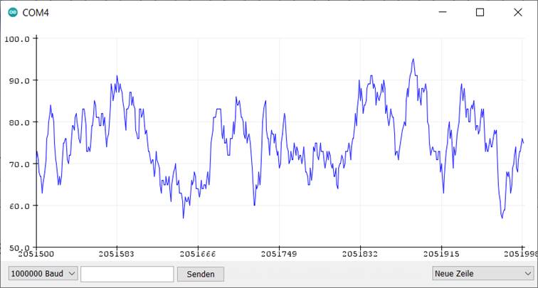 Kap 3.5 aus dem Arduino-Messlabor: Hier wird eine Lösung vorgestellt, die noch allein mit der Arduino-IDE und dem integrierten seriellen Plotter auskommt. Für den Anfang ist der serielle Plotter sehr bequem, weil man damit nicht an zwei Baustellen gleichzeig arbeiten muss. Als Zwischenlösung bietet es sich an, die Daten zuerst in einem Array zu speichern und dann erst abzusenden.