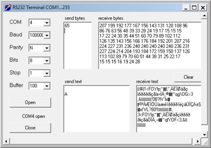 In einer Endlosschleife wartet das Programm auf Kommandos in Form einzelner Bytes. In der ersten Ausbaustufe wird nur ein Kommando erkannt. Wenn ein Byte 65 empfangen wurde, wird eine Messung mit 628 Punkten gestartet, indem adn=0 gesetzt wird. Das Kommando kann auch als einzelnes großes A gesendet werden. Beide Lesarten der Daten können von dem einfachen seriellen Terminalprogramm Ternimal.exe verarbeitet werden. Die empfangenen Daten zeigen das mit einem RC-Filter geglättete Sinussignal. Man erkennt deutlich das Maximum bei 240 und das Minimum bei 15.