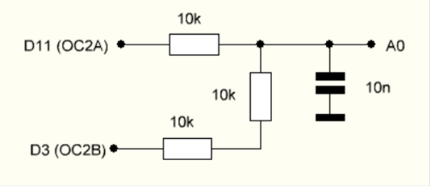 Bisher gibt es zwar zwei DDS-Ausgänge, aber nur einen Analog-Eingang. Zum Test bietet es sich an, beide DDS-Ausgänge mit jeweils 10 kΩ oder auch unterschiedlichen Widerständen auf den gemeinsamen Eingang A0 zu führen und mit 10 nF zu glätten. Das Oszilloskop zeigt dann die Summe beider Signale. Wenn man leicht unterschiedliche Frequenzen einstellt, erscheinen die typischen Schwebungen.