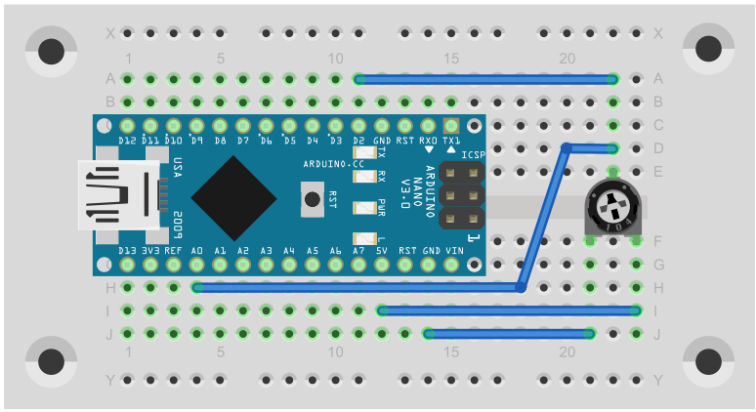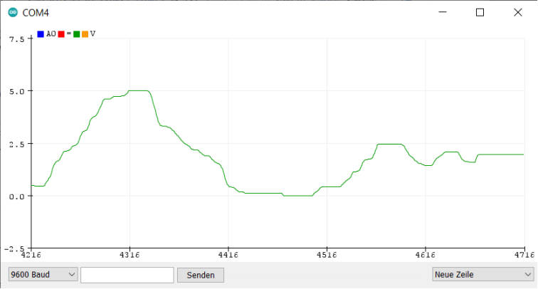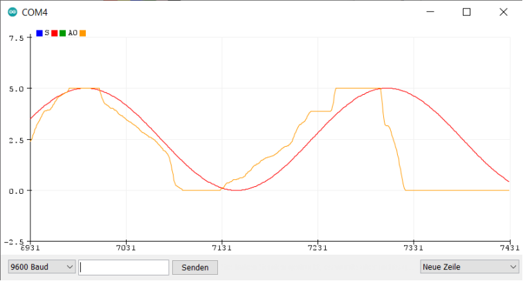 Das Spiel geht so: Im seriellen Plotter entstehen zwei Linien. Die eine folgt einer perfekten Sinusfunktion. Die andere steuerst du mit dem Poti am Anschluss A0. Die Aufgabe besteht darin, beide Linien so gut wie möglich zur Deckung zu bringen. Du musst also die Spannung am Poti so nachstellen, dass sie der berechneten Kurve folgt.