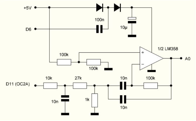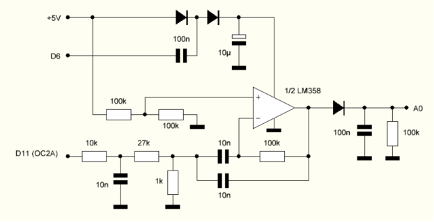 Eine alternative Messung verwendet einen Signalgleichrichter mit einer Diode und einem RC-Glied. Der Gleichrichter funktioniert wie der in Kap. 8.4, braucht aber nur eine einfache Diode, weil der OPV-Ausgang eine geringe Impedanz hat.