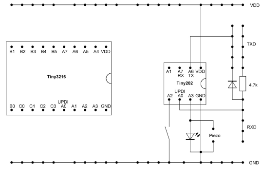 In diesem Fall soll die Küchenuhr fünf Minuten laufen. Ein Druck auf den Tastschalter an PA2 startet die Zeit. Der Controller liefert zur Bestätigung einen kurzen Signalton am Ausgang PA3. Nach Ablauf der Zeit ertönt ein längerer Ton. Parallel kann am Port PA3 auch noch eine LED für die optische Kontrolle angeschlossen werden.