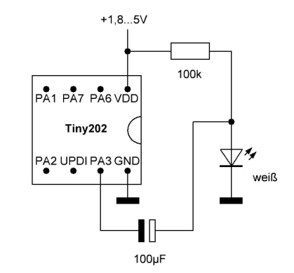 Im Schlafmodus verbraucht der Tiny202 nur ca. 1 µA. Im aktiven Modus, der aber nur 1 ms dauert, werden bei einem Takt von 32 kHz etwa 10 µA gebraucht. Wichtig ist, dass kein Port einen offenen Eingang hat, was zu einem zusätzlichen Verbrauch führen würde. Deshalb werden alle Ports als Ausgänge geschaltet. Der tatsächliche Verbrauch wird durch den Ladestrom über 100 kΩ und den kurzen Impulsstrom bestimmt, der im Durchschnitt noch einmal den gleichen Strom benötigt. Im Durchschnitt ergibt sich dabei ein mittlerer Verbrauch von etwa 30 µA.
