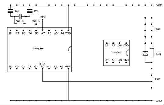 Der Tiny3216 hat die beiden Anschlüsse TOSC1 und TOSC2 (B3, B2) zum Anschluss eines externen Uhrenquarzes mit 32,768 kHz. Um ihn zu aktivieren, muss man den Quarzoszillator im Register CLKCTRL_XOSC32KCTRLA einschalten. Zusätzlich müssen zwei kleinen Kondensatoren mit ca. 12 pF angeschlossen werden. Der Oszillator kann dann den Takt für einen Timer liefern oder auch den Controller-Takt, wie es im Beispiel gemacht wurde.