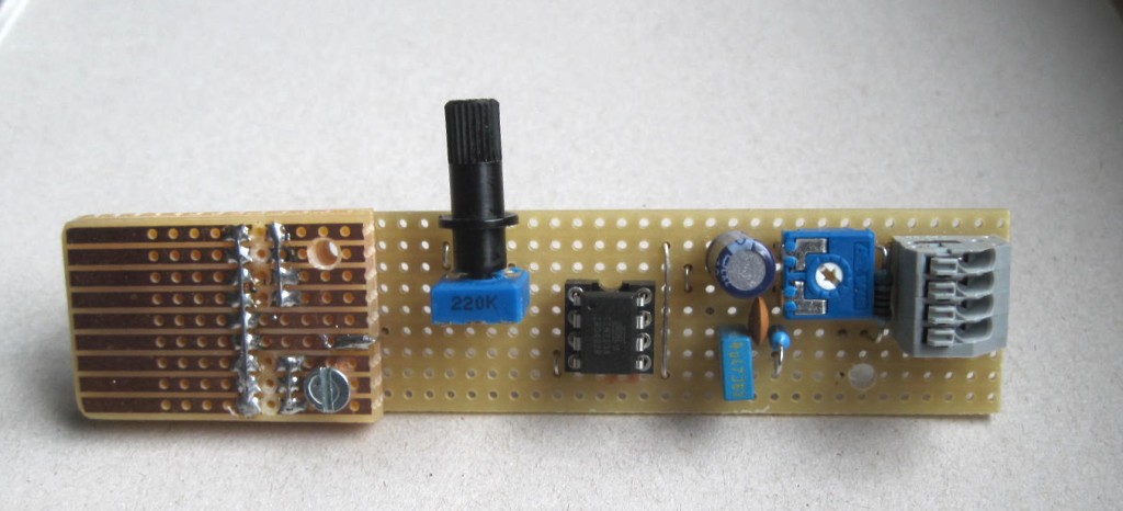 Die beiden Sensorflächen bestehen aus Streifenleiterplatinen. Sie sind Rücken an Rücken verschraubt bzw. verlötet (im hinteren Teil, der auf Masse liegt, die eigentlichen Sensorflächen sind davon durch Unterbrechungen isoliert). Dazwischen liegen 2 Lagen kupferfreie Hartpapier-Lochrasterplatte, die den Abstand vergrößern und die kapazitive Kopplung vermindern sollen.