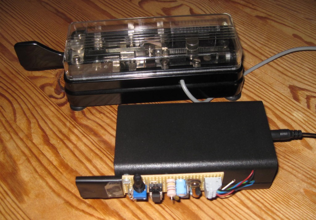 So hatte ich ebenfalls meinen knapp 50 Jahre alten Hi-Mound BK-100 hervor gekramt und benutze ihn fast täglich in einer Bug-Sideswiper-Runde per Internet-Telegrafie sowie auf KW, wenn ich dort jemanden mit Bug-Sound höre. Daraus entstand die Idee, für portable Einsätze eine elektronische Nachbildung der Bug-Eigenheiten auf einem ATtiny 13 zu programmieren. Für diesen “Bug” benötigt man keine waagrechte, feste Tischfläche; man kann ihn einfach in die linke Hand nehmen und mit der rechten Hand bedienen.